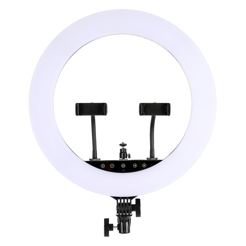 Kit anneau lumineux LED, idéal pour les prises de vue vidéo via smartphone (2 supports) mais aussi 1 mini rotule pour fixer un boîtier. Le kit contient également une télécommande sans fil pour régler l'intensité lumineuse et la température de couleur, un déclencher à distance et une housse de rangement noire.