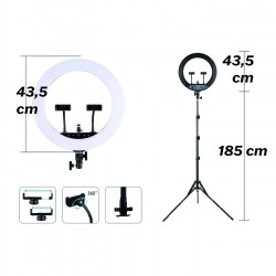 Kit de anel de luz LED, ideal para filmar vídeo via smartphone (2 parênteses) mas também 1 mini articulação esférica para fixar uma câmara. O kit inclui também um controlo remoto sem fios para ajustar a intensidade da luz e a temperatura da cor, um gatilho remoto e um saco de armazenamento preto.